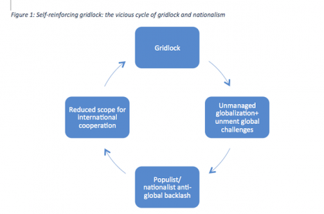 We see such trends across many different kinds of countries. But the anti-global backlash is heterogeneous and rife with contradictions. It encompasses terrorism in the name of Islam, and Islamophobic discrimination against Muslims. It includes leftist rejection of trade agreements, and right-wing rejection of environmental agreements. The powerful tie that unites these disparate movements is a rejection of global interdependence and collective efforts to govern it. The resulting erosion of global cooperation is the fourth and final element of self-reinforcing gridlock, starting the whole cycle anew.