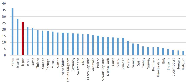 However, as of 2014, the Japanese wage gap was the third highest after those of Korea and Estonia (among OECD countries), as shown in Figure 2. In short, the gender wage gap in Japan has been decreasing but is still large.