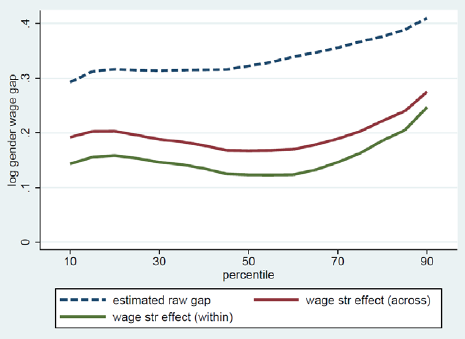 Meanwhile, there could be two pathways for generating a gender wage gap: gendered job allocation into relatively lower paying jobs within a single company, and into low paying companies. The green line in Figure 3 shows wage structure effects while controlling for establishment fixed effects. The gender gap at each percentile reduces in relation to the red line, but still exists, indicating that both the glass ceiling and sticky floor phenomena exist even within an establishment.