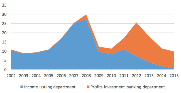 Figure 1 shows the evolution of the two profit centres of the Eurosystem over time. It is apparent that during ‘normal’ times the issuing department dominates. The relative proportions change radically when the ECB starts to adopt unconventional measures and (recorded) investment banking profits soared when the ECB started to buy bonds in 2011/12.