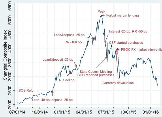 From mid-June to early July of 2015, the Chinese Shanghai Stock Exchange Composite Index (SSECI) plunged by 32%, wiping out more than RMB 18 trillion in share value from its 12th June peak. The value lost was equivalent to about 30% of China’s GDP in 2014 and about 20% of US GDP in 2014. Figure 1 presents the SSECI index and some major events that happened during the period from 1st July 1 2014 to 30th September 2015.