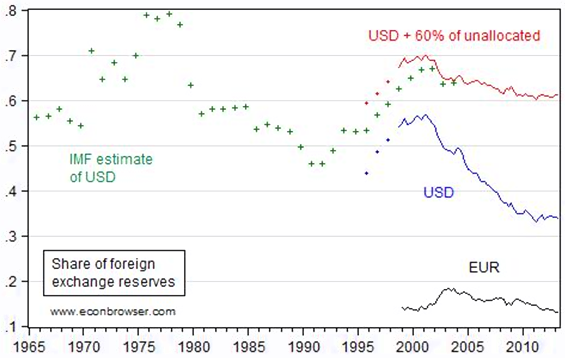 Chinn, Menzie (2013), “What Currencies are Foreign Exchange Reserves Held In?”, Econbrowser, 31 October.