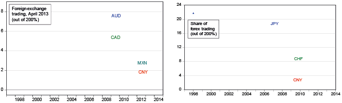 Figures 2 and 3. The yuan’s share has risen, but still ranks low