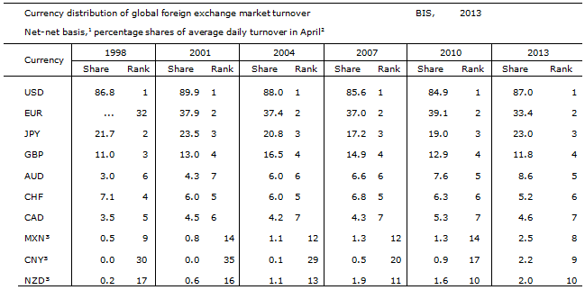 Bank for International Settlements (2013), “Triennial Central Bank Survey – Foreign Exchange Turnover in April 2013: preliminary global results”, Monetary and Economic Department, September.