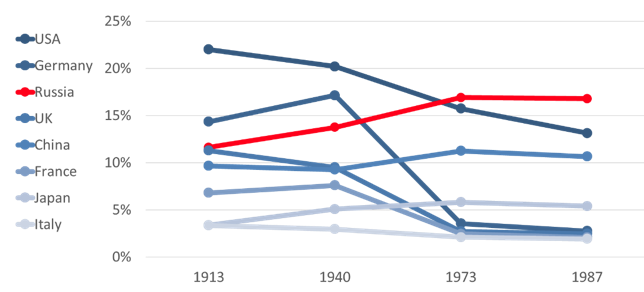 Figure 1 shows the great powers on a standard measure developed by political scientists to capture ‘the ability of a nation to exercise and resist influence’ in the world. By the 1970s, on that measure, the Soviet Union became the world’s leading power. Yet its economy produced less than half of the real GDP of the US, despite a population of similar size, spread across a much larger territory.