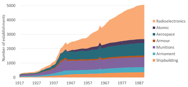 Figure 3 The Soviet defence industries, 1917-1987: Number of production, research, and design establishments by branch