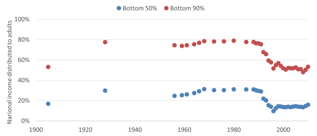 Figure 4 Income shares, 1905-2016 (selected years): bottom 50% and bottom 90%