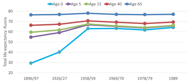Figure 5 Russian males’ total life expectancy, 1896/97 to 1989 (census years), at birth and various ages